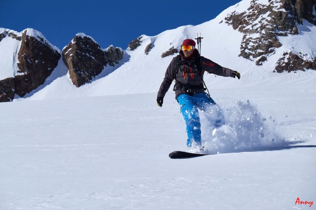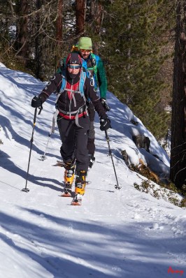 Spelliamo con calma e ci lanciamo in discesa, a tratti la neve è farinosa, nelle zone in ombra invece con una leggera crosticina superficiale.