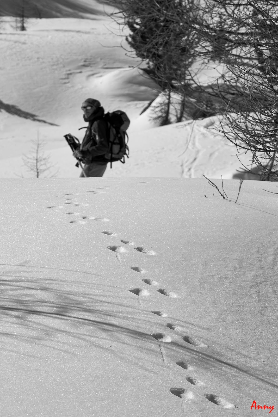 Intanto anche il vento sembra darci una tregua. La neve è molto ventata e negli avvallamenti dove si hanno cambi di pendenza si vedono enormi accumuli. Siamo un pò preoccupati anche per l’innalzamento pomeridiano della temperatura. Per giunta non siamo neanche rassicurati dall’incontro di uno sciatore che sta scendendo con un solo bastoncino. Infatti ci racconta di essere appena stato travolto da una piccola valanga che l’ha spinto contro delle roccette. Nessuna conseguenza grave per fortuna, se la caverà con un passaggio al PS per ricucire una mano ferita. Valutando attentamente la traccia in salita, a culo stretto, percorriamo comunque la lunga salita in relativa sicurezza.