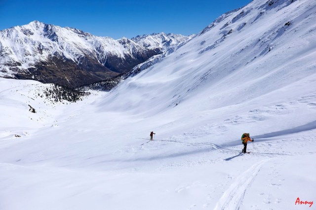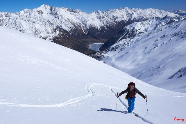 Rapido consulto e si cambia programma: la nostra nuova meta sarà il SaldurSpitze. L’esposizione e la sua posizione sembra che ci possano riparare dal vento. Ci toccherà però partire da 1900 sci a piedi e salire fino a 3430, un ben 1500 di dislivello.