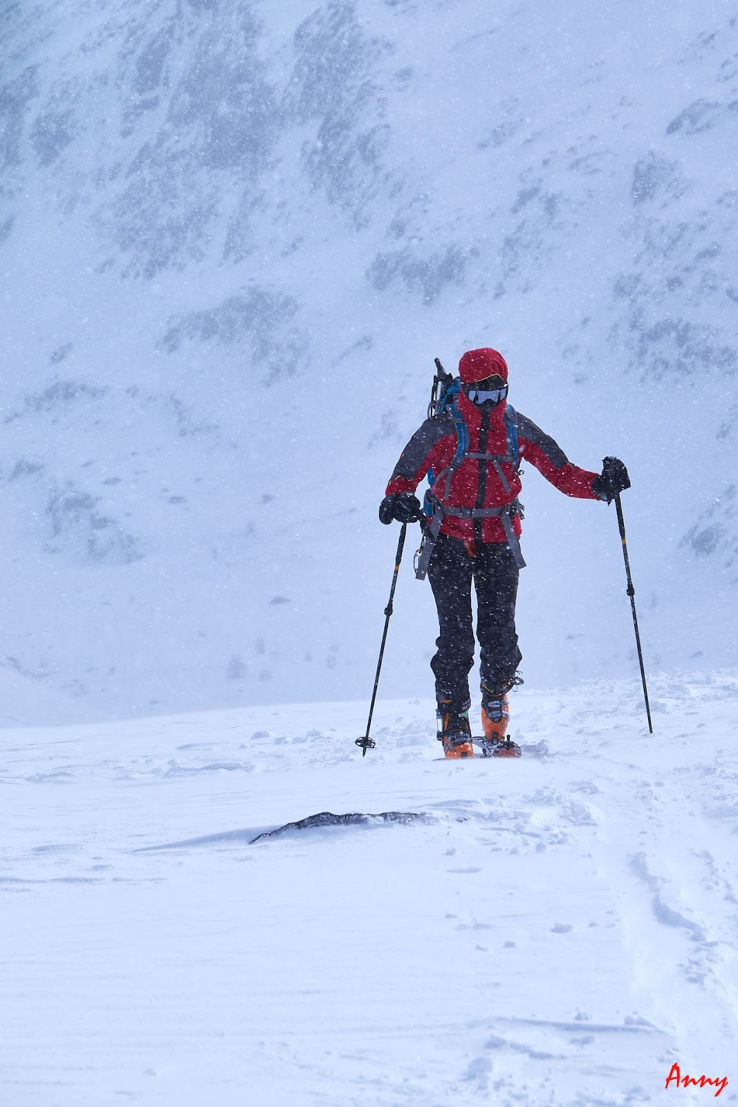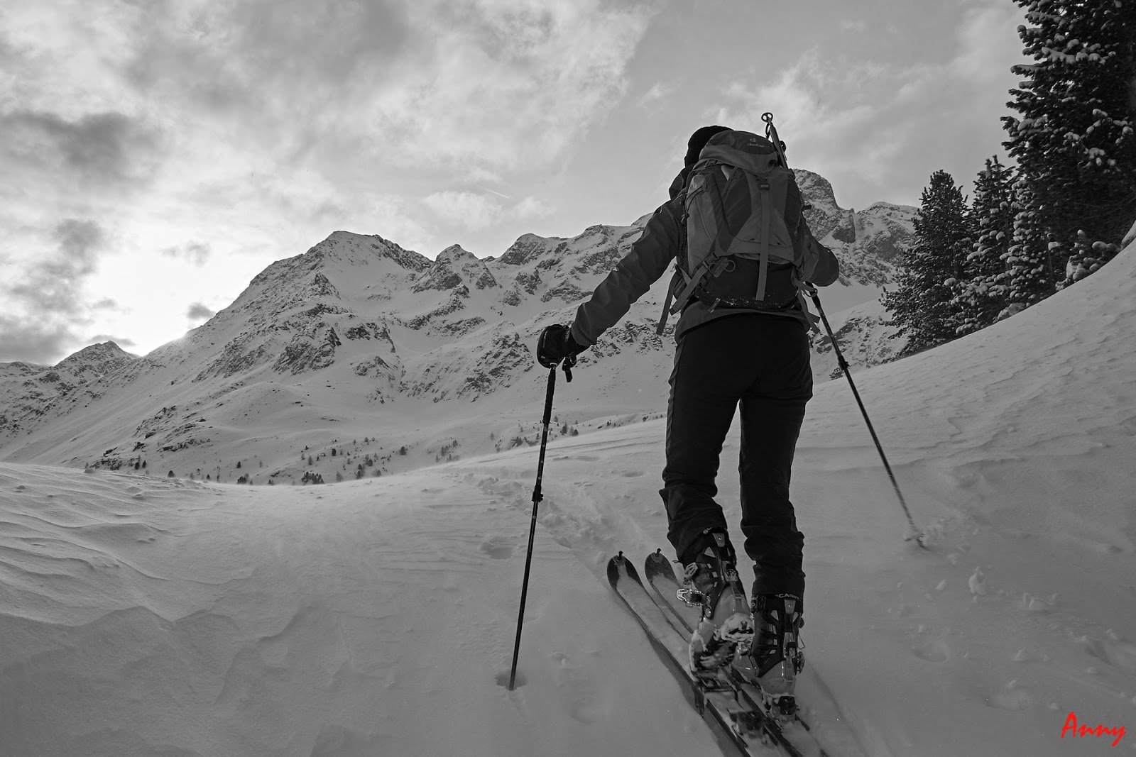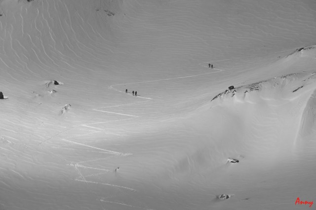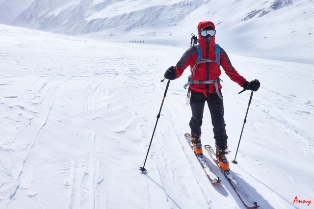 Meno di 100 metri di dislivello ci separano dalla vetta, ma la situazione ci sembra al limite. Un grosso distacco di neve ventata taglia tutto il muro su cui dovremmo passare e non ci fidiamo. Decidiamo di aspettare altri sci alpinisti che arrivano per scambiarci le opinioni, ma siamo un po’ avanti e ci tocca aspettare almeno mezz’ora prima di vedere arrivare i primi due. Sono padre e figlio forse austriaci, secondo il padre non c’è pericolo e ci indica una traccia (che poi farà) che io non avrei scelto. Nel frattempo siamo congelati e dobbiamo prendere una decisione. Niente, rimaniamo della nostra idea. Ci caviamo le pelli e iniziamo la lunghissima discesa su ghiacciaio. Davanti a noi il gran Zebrù sembra guardarci severo.