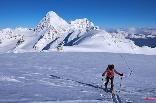 Per questo lungo we pasquale non ho scelta: anny è da una settimana che mi parla del Cevedale e non avendo proposte migliori, dopo un accurata valutazione, si decide di partire. Lasciamo la bassa un po’ uggiosa sabato pomeriggio diretti in val Martello dove pernottiamo nel nostro furgone nei pressi dell’hotel paradiso (quota 2050) da dove partono diverse scialpinistiche. Alle 7,20 della domenica mattina abbiamo già gli sci ai piedi e iniziamo la luuuuunga ma dolce salita che ci porta fino al rifugio casati (quota 3250).