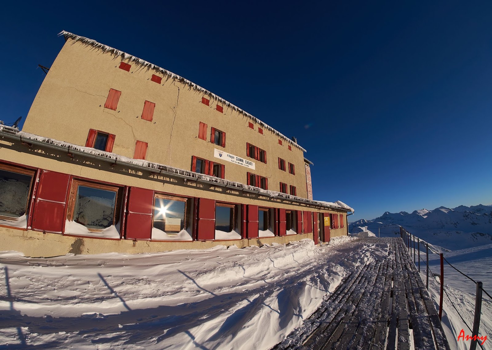 Arriviamo circa all’ora di pranzo, giusto in tempo non solo per un buon piatto di pasta, ma anche perchè subito dopo il nostro arrivo la visibilità si fa molto critica e il vento, che già ci aveva accompagnato per tutta la salita, sbuffa con ancora più cattiveria.
