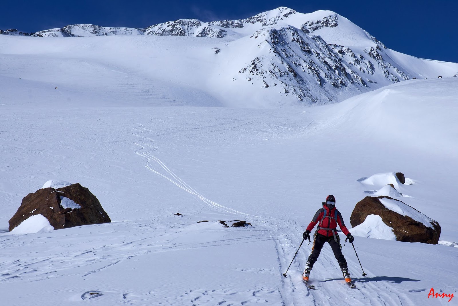 Attraversiamo il ghiacciaio, in un ambiente unico e mozzafiato. In poco tempo arriviamo sotto alla pala finale.