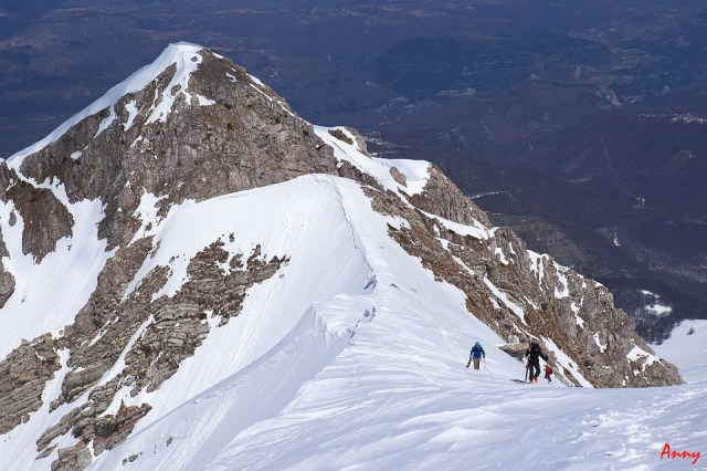 Dopo aver spellato ed esserci rifocillati un po’ siamo pronti per ripartire. Qui il gruppone si divide fra le tre possibili opzioni di discesa. Noi decidiamo di scendere per il canale Fosso del Monte. Dopo aver superato un tratto di cresta bello strettino ( che non avrei mai detto di fare con gli sci ai piedi) iniziamo a scendere lungo il canale. Qualche curva, poi desistiamo… Qualcuno di noi ha sentito un grosso Wuuum. Il canale è esposto al sole e viste le condizioni decidiamo di non rischiare e di risalire sulla cresta che ci separa dalla valle del Crivellaro. Anny mi indica una parte del canale dove non c’è neve e suggerisce di risalire da quella lingua d’erba per tornare sulla spalla e in pochissimo tempo lo fa. Io dietro arranco, con bastoncini e sci in mano riesco a salire solo di gambe, ma il pendio è veramente ripido e ho bisogno di appoggiarmi per non cadere, non so in che modo poter mollare qualcosa per caricarmi gli sci sullo zaino.