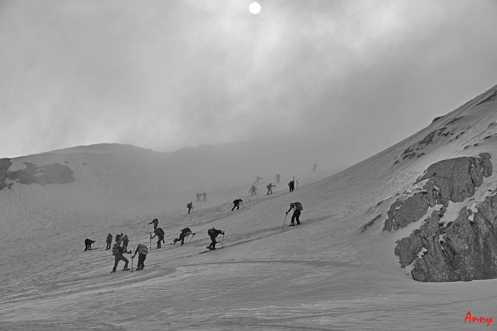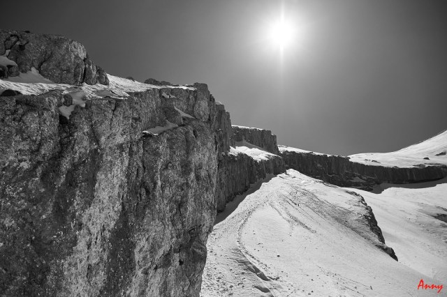 Noi proseguiamo fino ad arrivare al ripido canale e cercando di mantenere le dovute distanze di sicurezza iniziamo la lunga salita. Mentre vedo gli altri proseguire sicuri io sono al massimo della concentrazione, non è che sia proprio abituata a fare cose così ripide….ma me la sento!