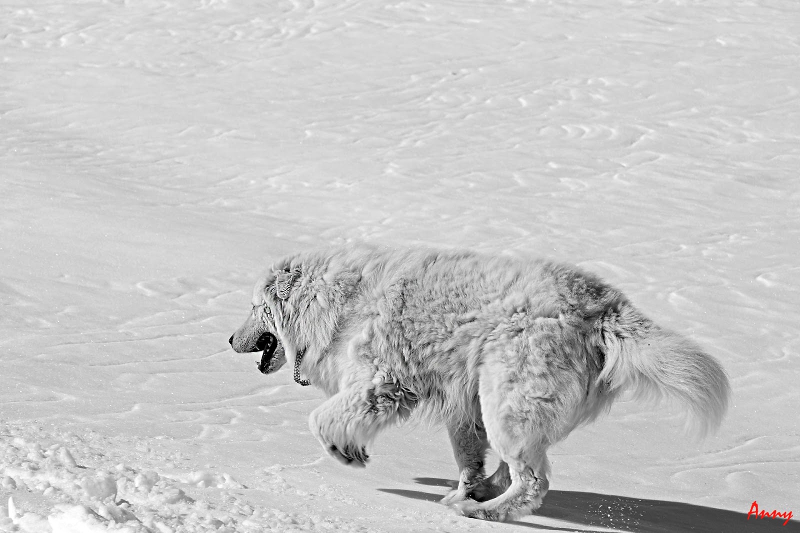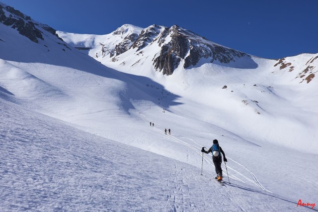Dopo un primo tratto tranquillo ci troviamo davanti ad un bel “muro” da superare dove vista la pendenza decidiamo di mettere i Rampant. L’ambiente è spettacolare e anche oggi il meteo ci regala una giornata favolosa. Superato il ripido pendio finalmente il terreno ci dà un po’ tregua con un lungo pianoro, che si innalza dolcemente fino ad inerpicarsi di nuovo in un altro ripidissimo canale. Mentre continuiamo ad avanzare un meraviglioso pastore abruzzese gironzola fra di noi come se volesse cercare di tenerci raggruppati come un gregge di pecore. Qui Giampa e la Virgi, già soddisfatti di quello che hanno fatto, decidono di salutarci e tornare indietro.