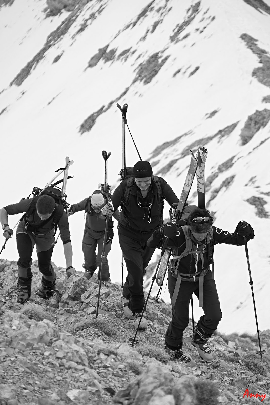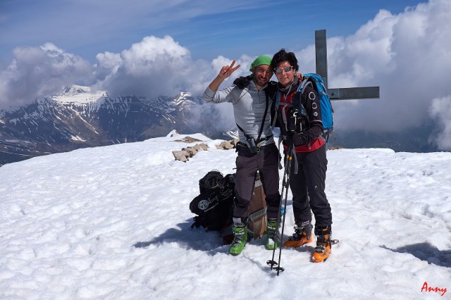 Entusiasti per la meravigliosa discesa su splendida neve primaverile ci agganciamo gli sci in spalla e iniziamo la lunga cavalcata sulla cresta del crinale.