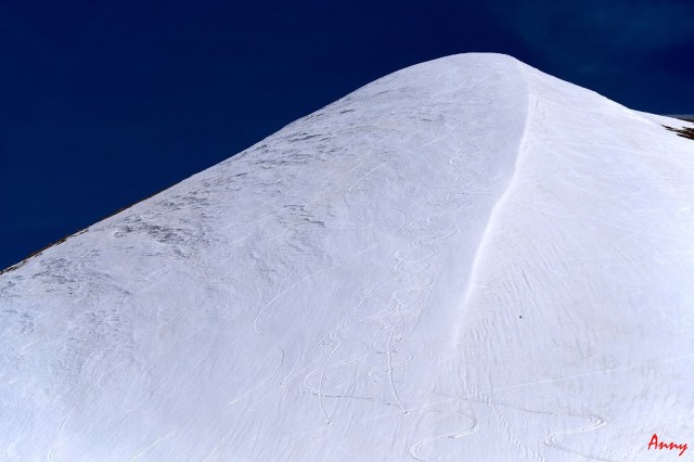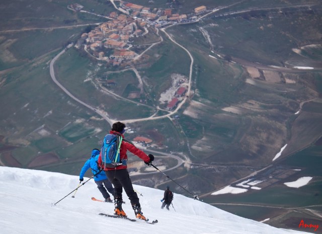Dopo la foto di rito, saremmo scesi per lo stesso itinerario di salita , se non fosse stato che li abbiamo conosciuto Michele. Gran conoscitore del posto, ci propone di proseguire il giro risalendo tutta la cresta fino ad arrivare alla cima del monte redentore e ridiscendere per il canale della virgola. Anny mi guarda con occhi languidi e lascia decidere a me essendo la meno esperta. Il giro è davvero meraviglioso, l’unica mia perplessità è quella di affrontare il canale la cui pendenza media è sui 40°……sarò in grado? Non potrò mai saperlo se non ci provo! Così ci uniamo a Michele e ai sui amici, con noi viene anche Giuseppe un ragazzo strapieno di entusiasmo e privo di cognizione della paura che scia da pochissimo. Ci buttiamo giù per la spalla sinistra del Vettore per una fantastica sciata fino a raggiungere di nuova la sella.