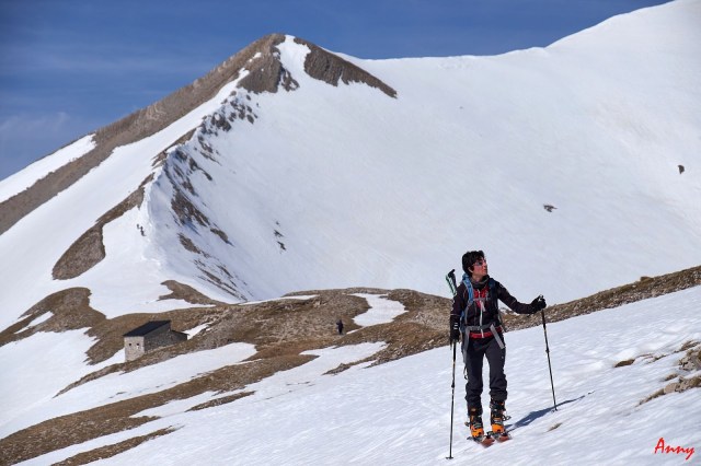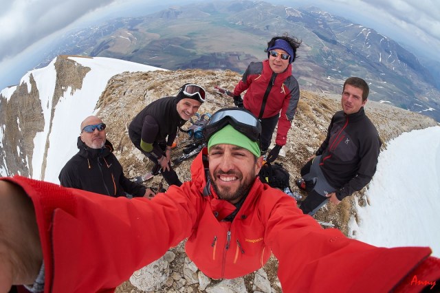 Un lungo traverso con tratti di sci in spalla ci separa fino a raggiungerla. Siamo sulla vetta più alta dei Sibillini!