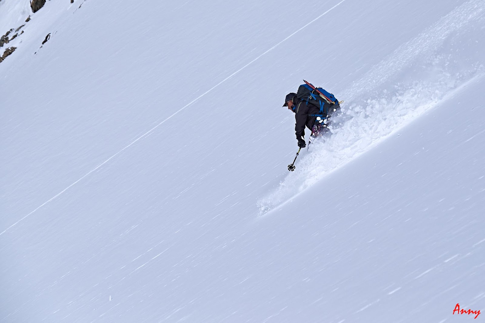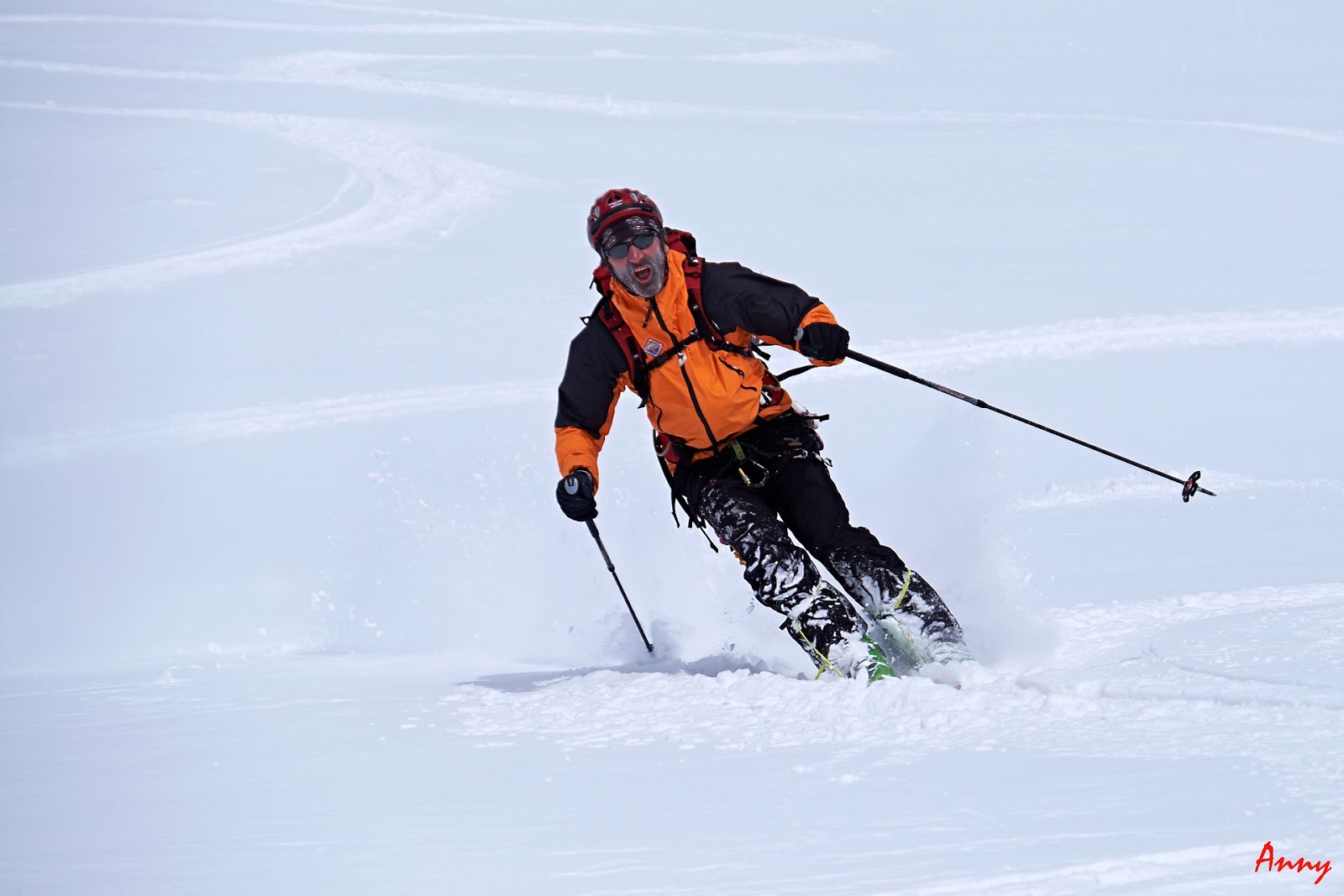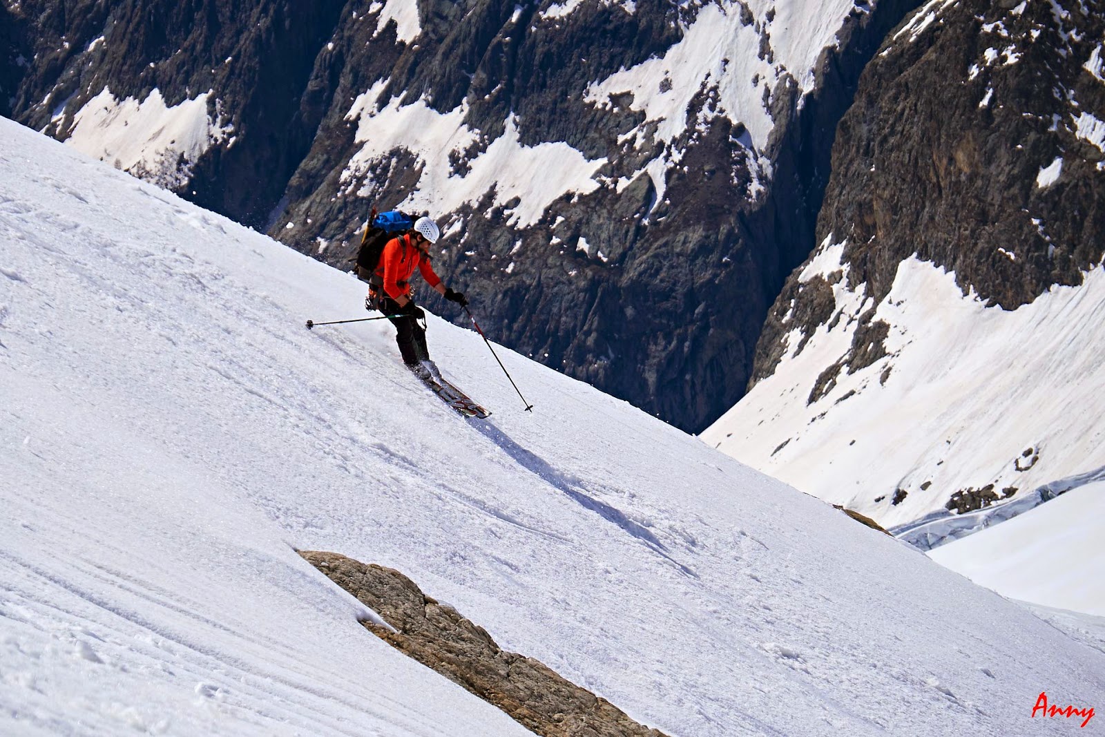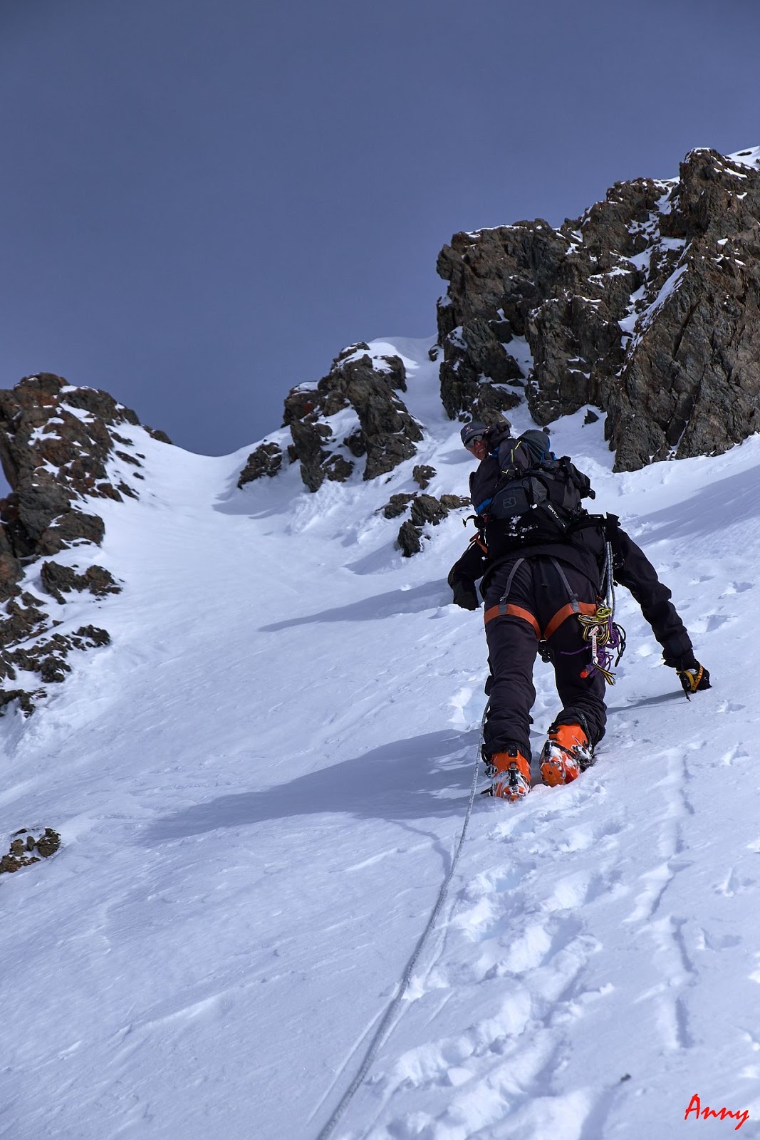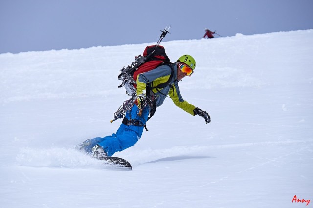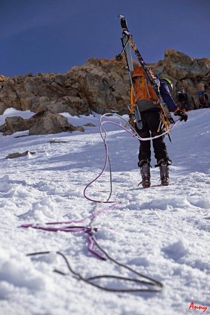 Seppur diretti verso la Dome de Neige, una volta raggiunto il pendio iniziale, il gruppo decide saggiamente di ripiegare su una gita più sicura. Le nevicate del giorno precedente hanno creato grossi lastroni da non sottovalutare. Ci dirigiamo quindi alla bella Pointe Xavier Blanc. I pendii sono tutti perfettamente innevati e ci pregustiamo già in salita la guduriosa powder. La neve non ci delude come previsto e torniamo contentissimi alla base. Qui prove di cordata e discese in corda doppia concludono egregiamente una giornata stupenda.