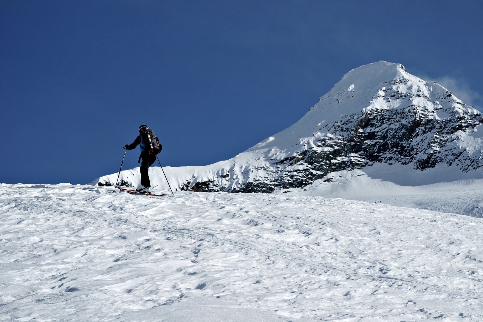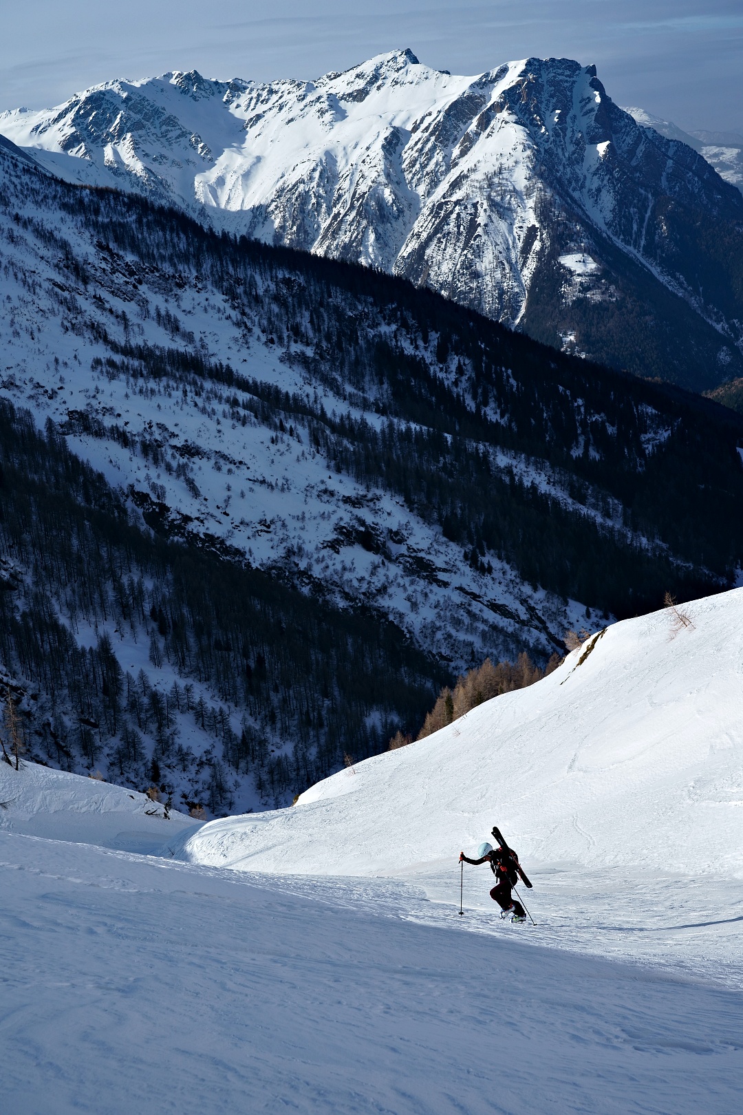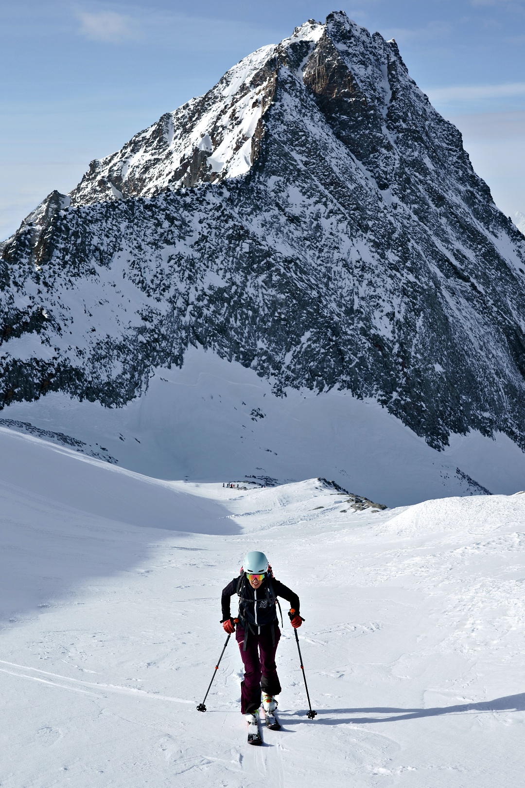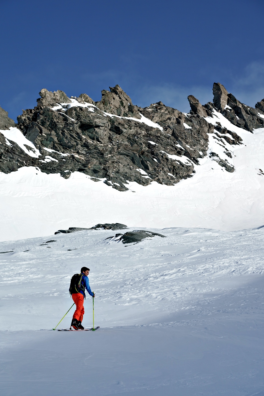 1700 metri di dislivello a giro è decisamente un eccesso per la mia quasi inesistenza preparazione scialpinistica. Ho comunque tenuto botta, più di testa che di fisico, e con gran soddisfazione alla fine ho raggiunto la vetta del Breithorn e la sella di punta del Rebbio. Mancava soltanto la cresta finale del Rebbio, ma direi che ci si possa tranquillamente accontentare.